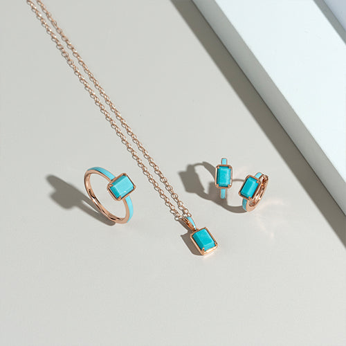 La turquesa es una de las piedras preciosas más antiguas del mundo, reconocible al instante por su aspecto opaco y su encantador color azul verdoso. Su superficie suele presentar intrincadas vetas marrones o negras, conocidas como "matriz", que le confieren un encanto rústico.
