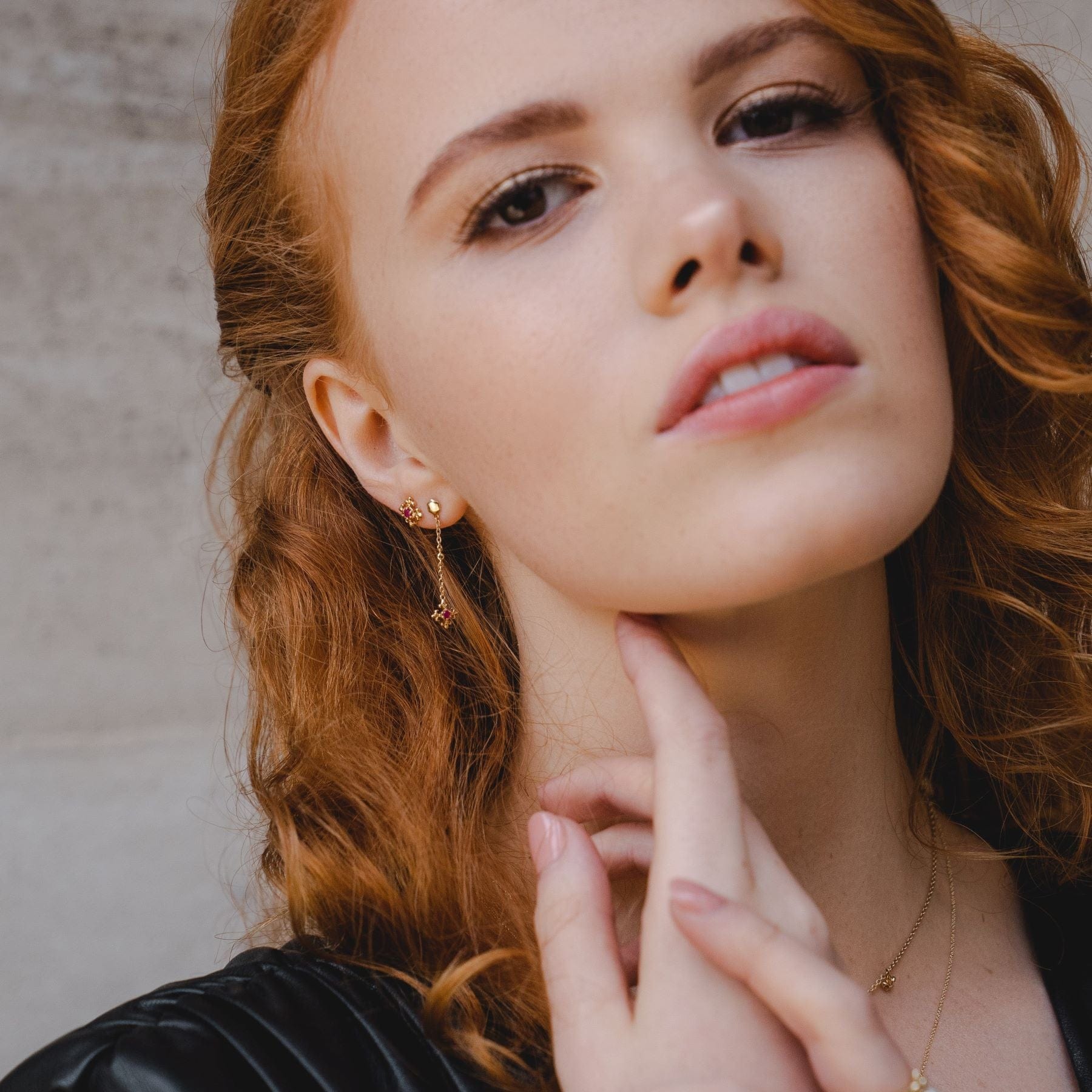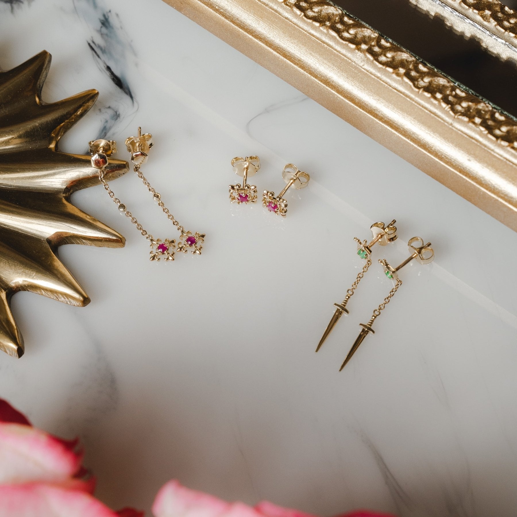 Pendientes colgantes con flor de lis y rubí ECFEW™ en oro amarillo de 9 quilates
