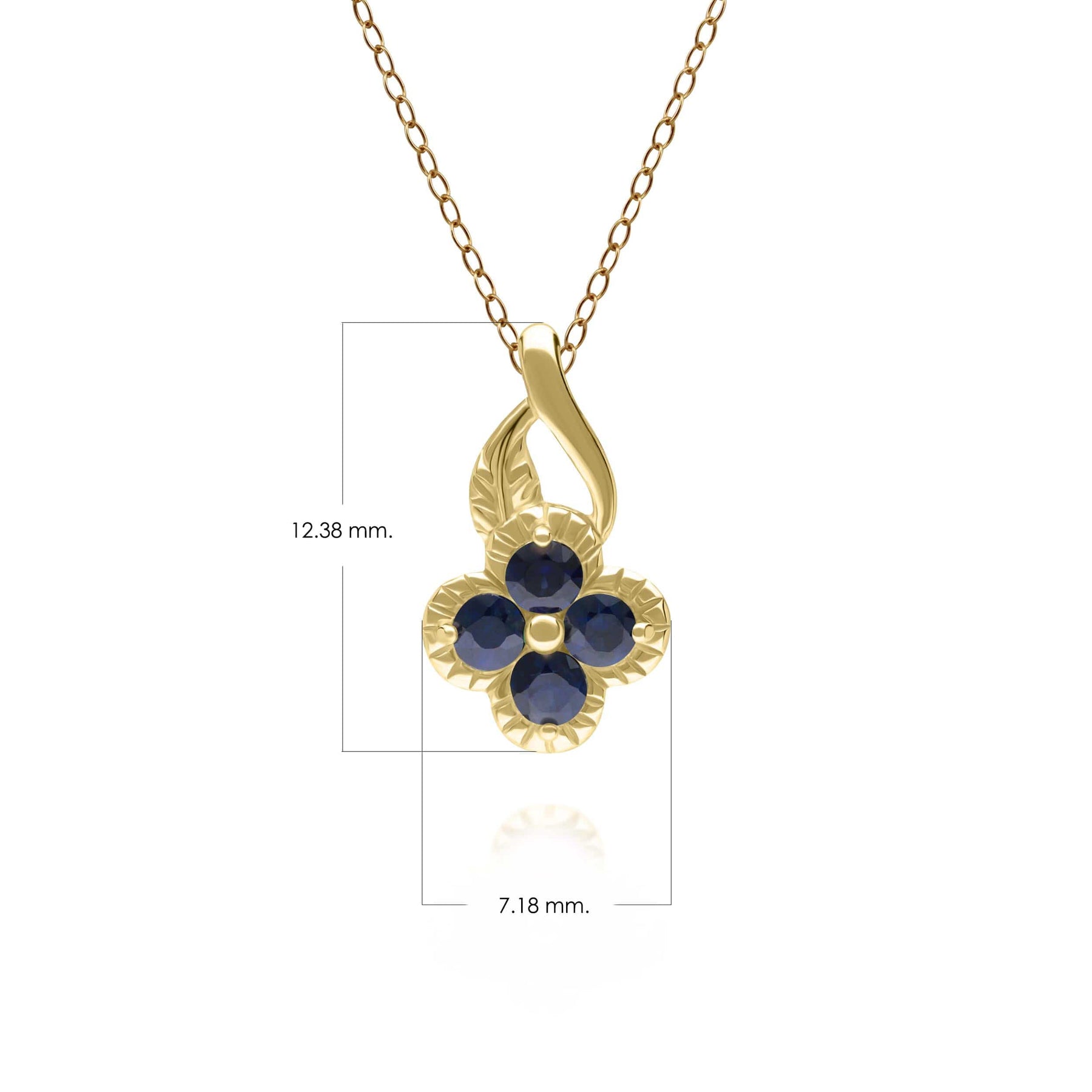 Inspirado en la naturaleza, este encantador colgante floral presenta cuatro zafiros azules engastados en una cabeza de cinco puntas. El cuerpo de oro amarillo de 9 quilates presenta un detallado diseño de hojas sinuosas y viene con una cadena de oro a juego.
