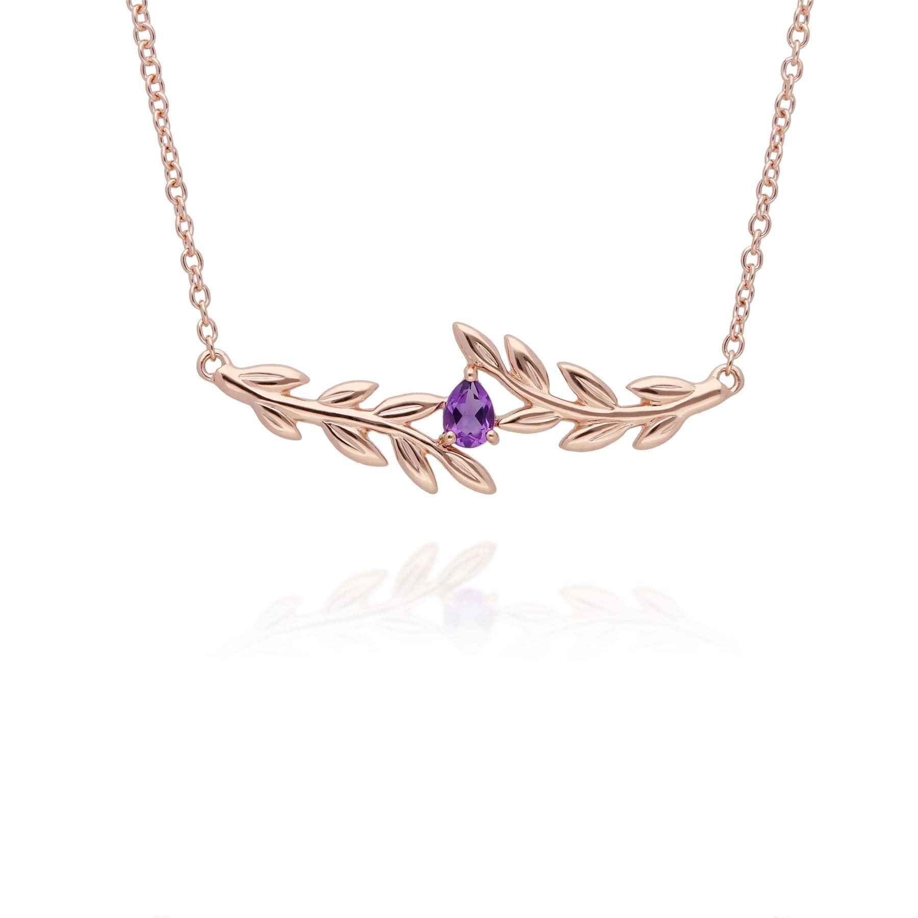 Un elegante collar de oro rosa de 9 quilates inspirado en la naturaleza con una piedra preciosa central de amatista talla pera en un hermoso motivo de rama de olivo. La rama de olivo es un símbolo de paz universalmente conocido.
