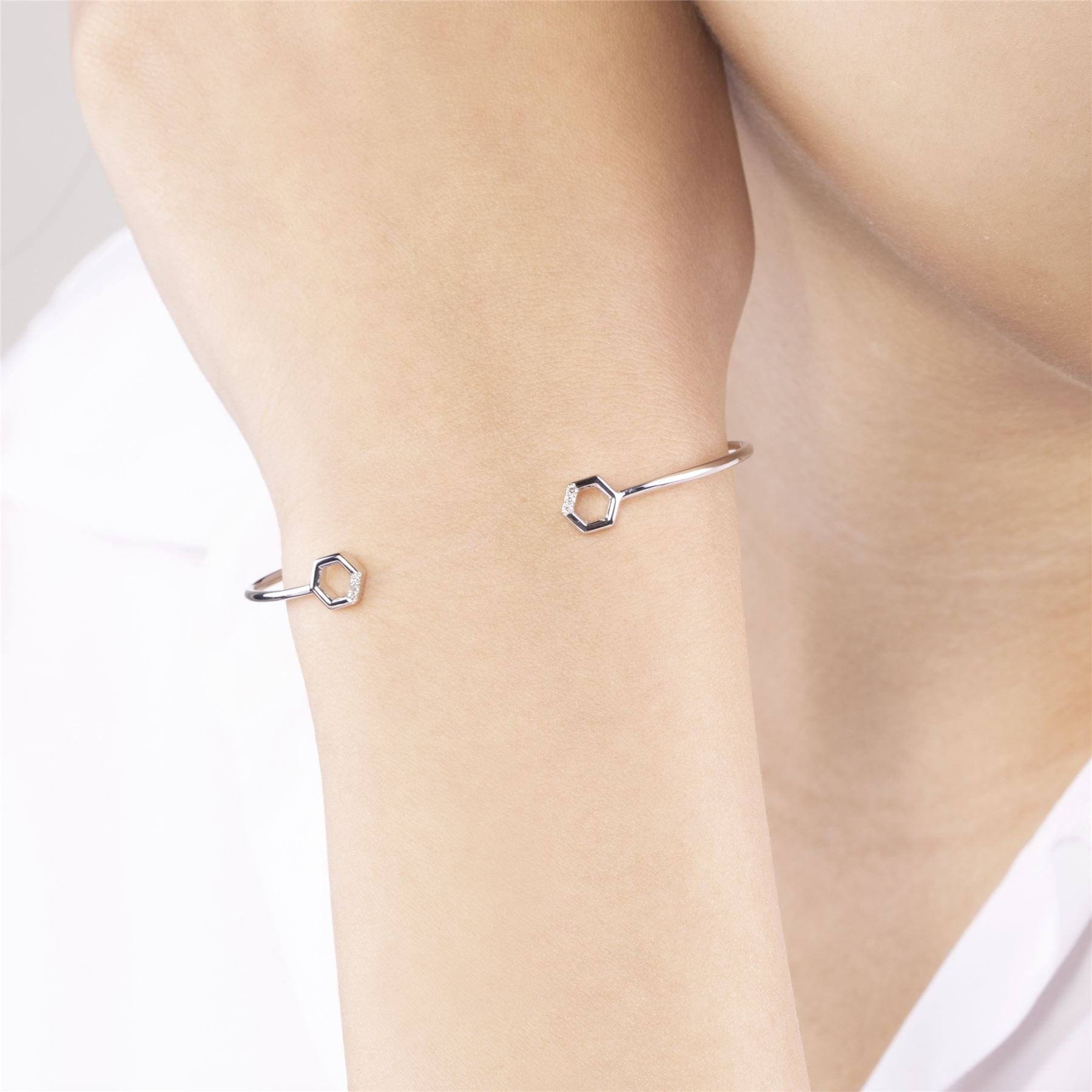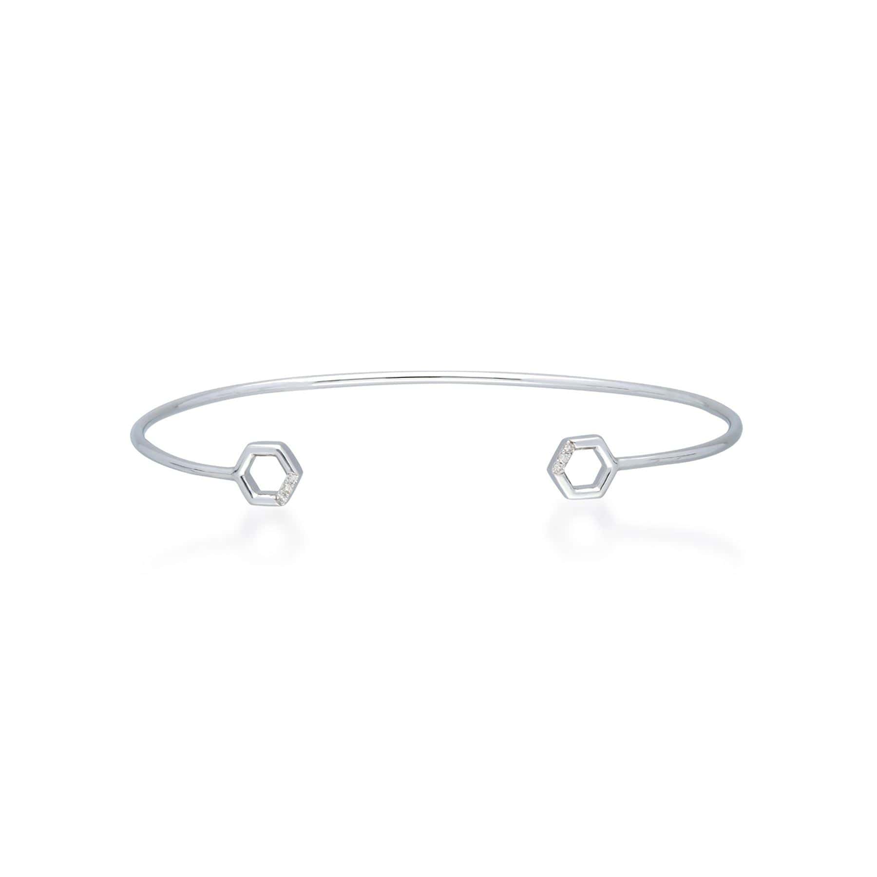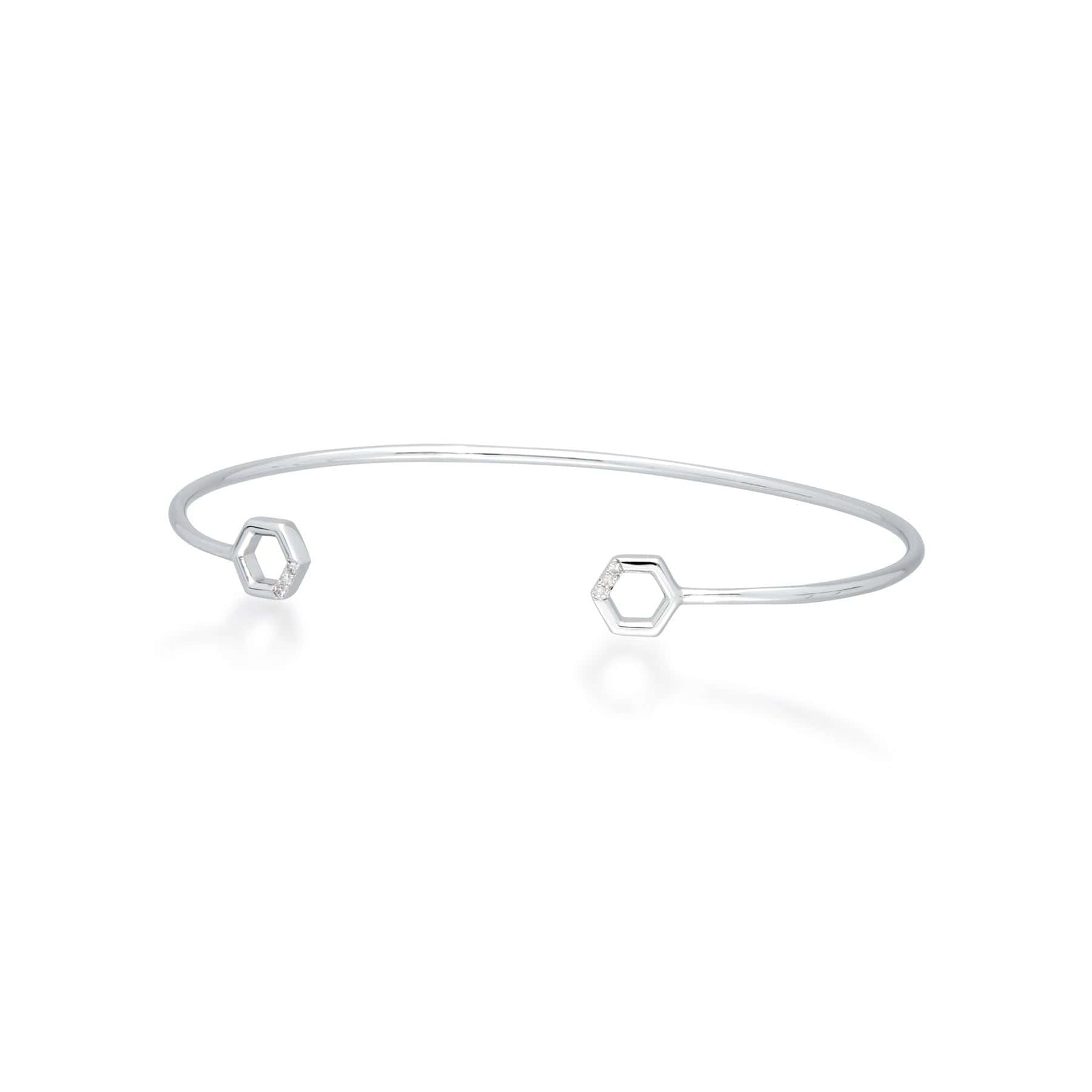 Un elegante y delicado brazalete de oro blanco de 9 quilates con hexágonos abiertos pavé de diamantes. Combínalo con piezas geométricas de la Colección de Diamantes de Gemondo para completar el look.