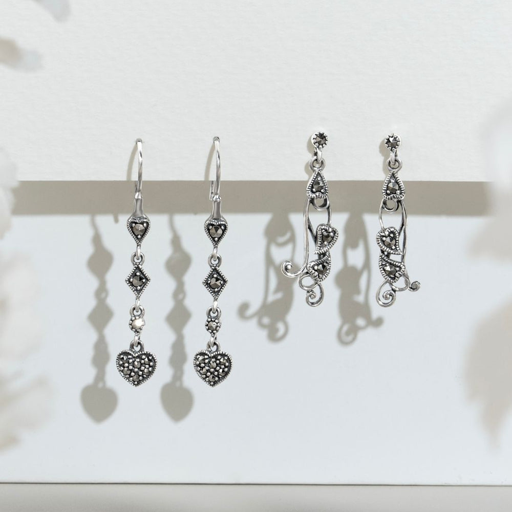 Un par de impresionantes aretes con forma de corazón hechos de plata esterlina con 9 piedras preciosas de marcasita engastadas en pavé en cada arete