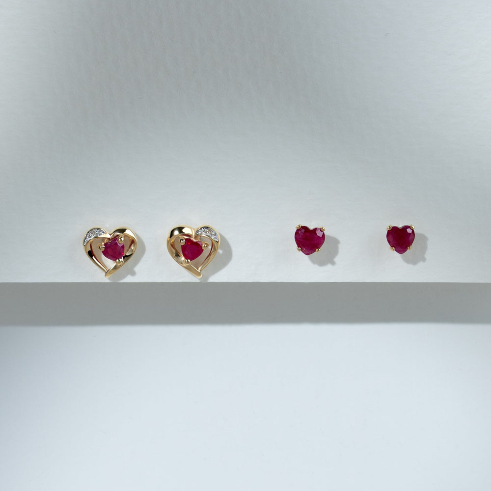 Pendientes de tuerca con diseño de corazón clásico elaborados en oro amarillo de 9 quilates y engastados con una piedra preciosa de rubí tallada en corazón.