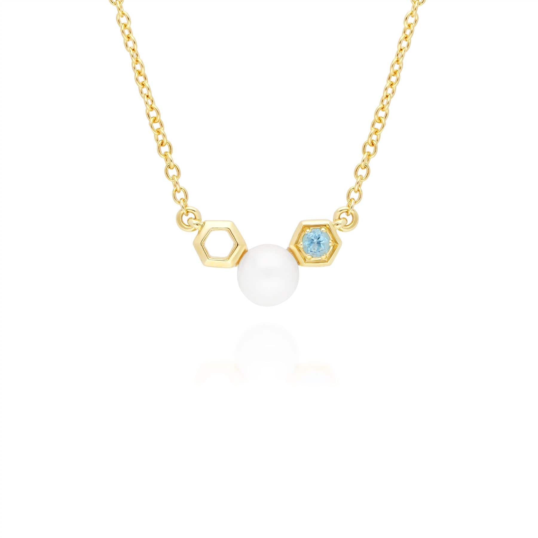Un moderno collar geométrico de oro amarillo de 9 quilates con un topacio azul de talla redonda y una perla de agua dulce en engastes hexagonales inspirados en un panal. Combine y combine este hermoso collar con sus joyas favoritas de la colección Modern Pearl de Gemondo.