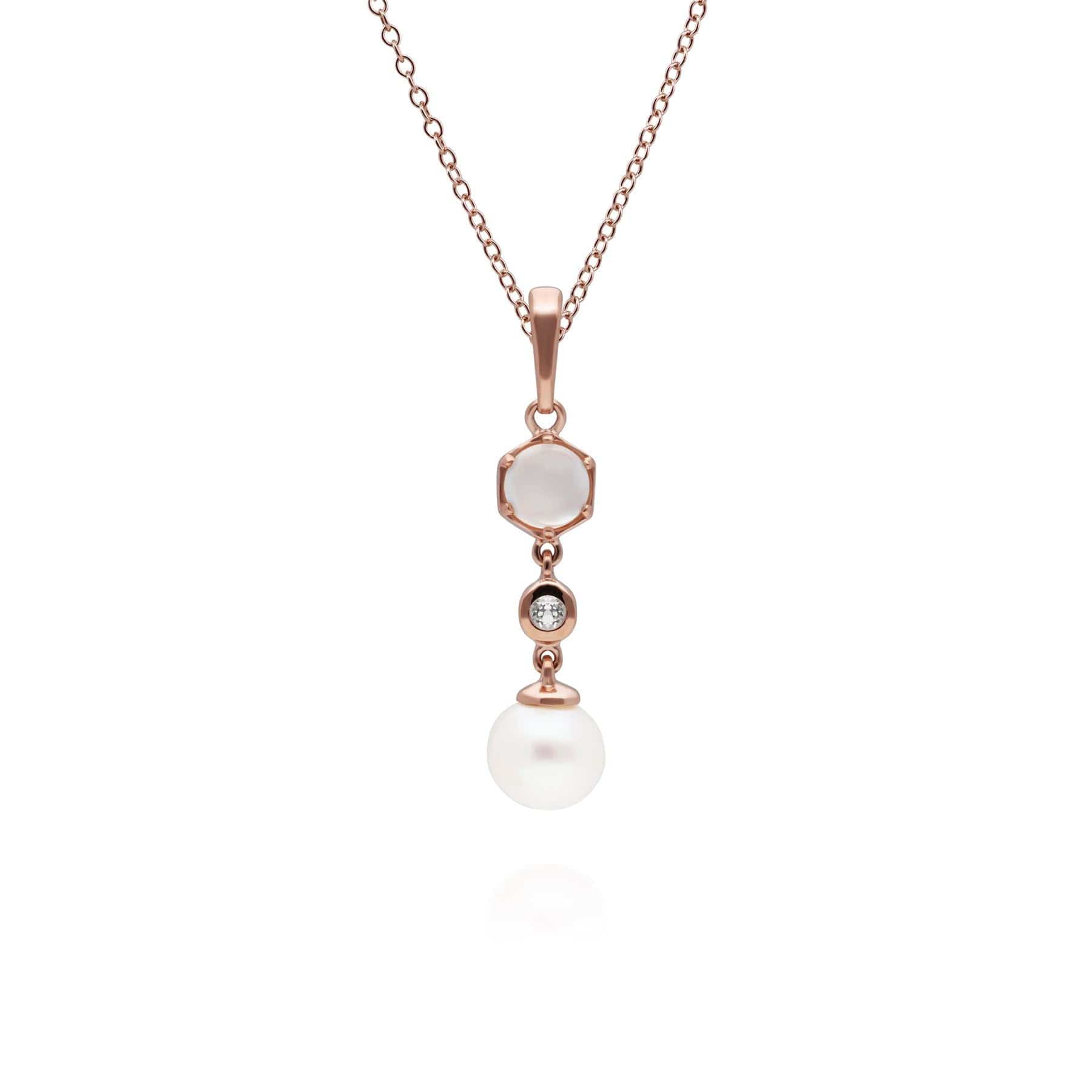 Un colgante de gota elegante y contemporáneo con una perla cultivada de agua dulce que cuelga maravillosamente de un engaste geométrico decorado con piedra lunar y topacio blanco. Este colgante está suspendido de una cadena de plata de primera ley con baño de oro rosa a juego.
