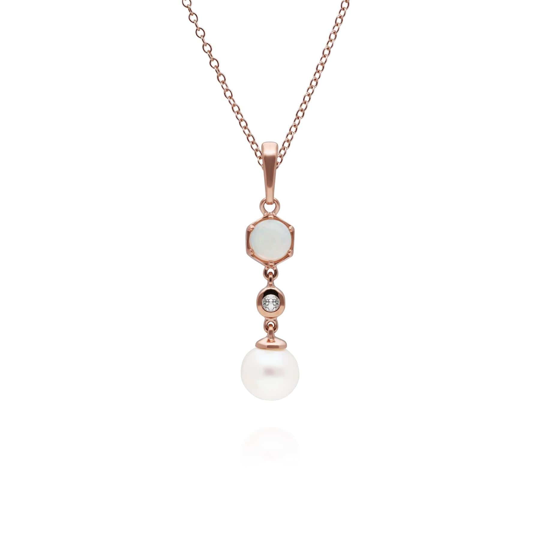Un colgante de gota elegante y contemporáneo con una perla cultivada de agua dulce que cuelga maravillosamente de un engaste geométrico decorado con ópalo y topacio blanco. Este colgante está suspendido de una cadena de plata de primera ley con baño de oro rosa a juego.