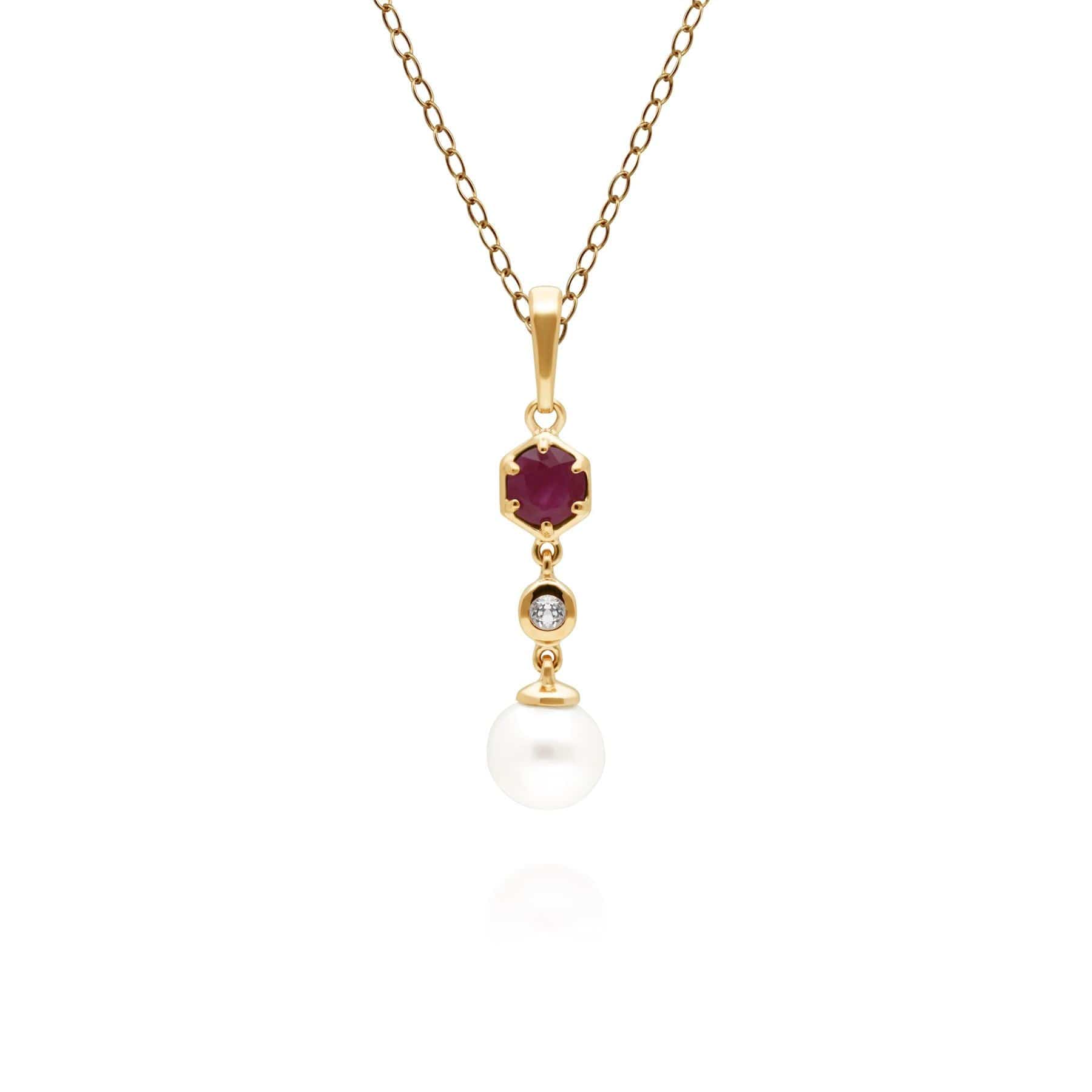 Un colgante de gota elegante y contemporáneo con una perla cultivada de agua dulce que cuelga maravillosamente de un engaste geométrico decorado con un rubí rojo y un topacio blanco. Este colgante está suspendido de una cadena de plata de primera ley recubierta de oro amarillo a juego.