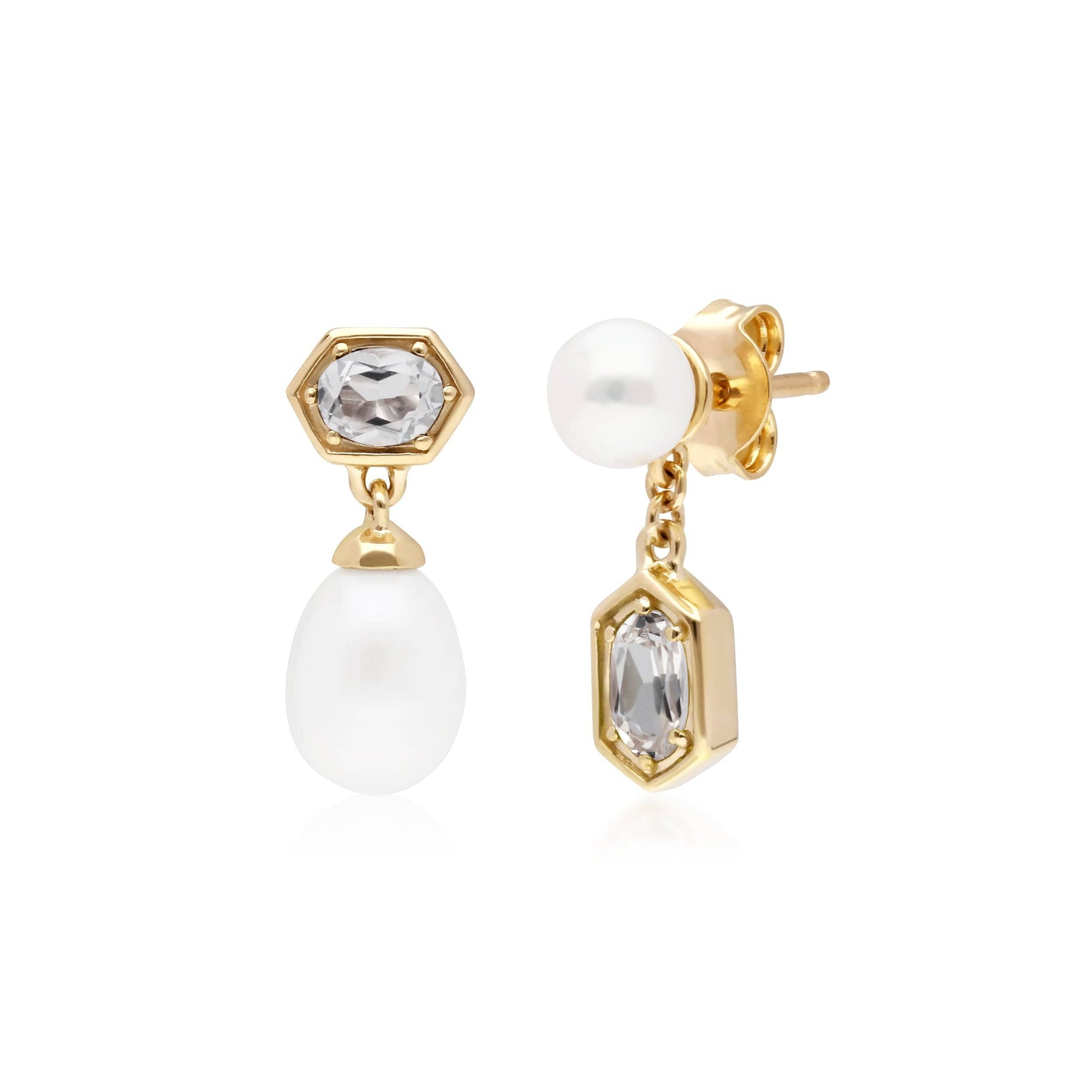 Un par de aretes colgantes no coincidentes de plata de ley chapada en oro amarillo contemporáneo con perlas colgantes y gemas de topacio blanco. Estos aretes tienen un dorso de poste y mariposa y son adecuados solo para orejas perforadas.