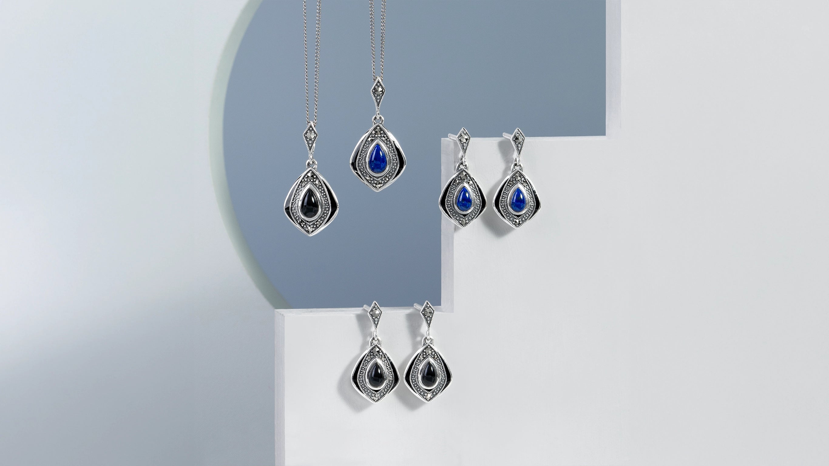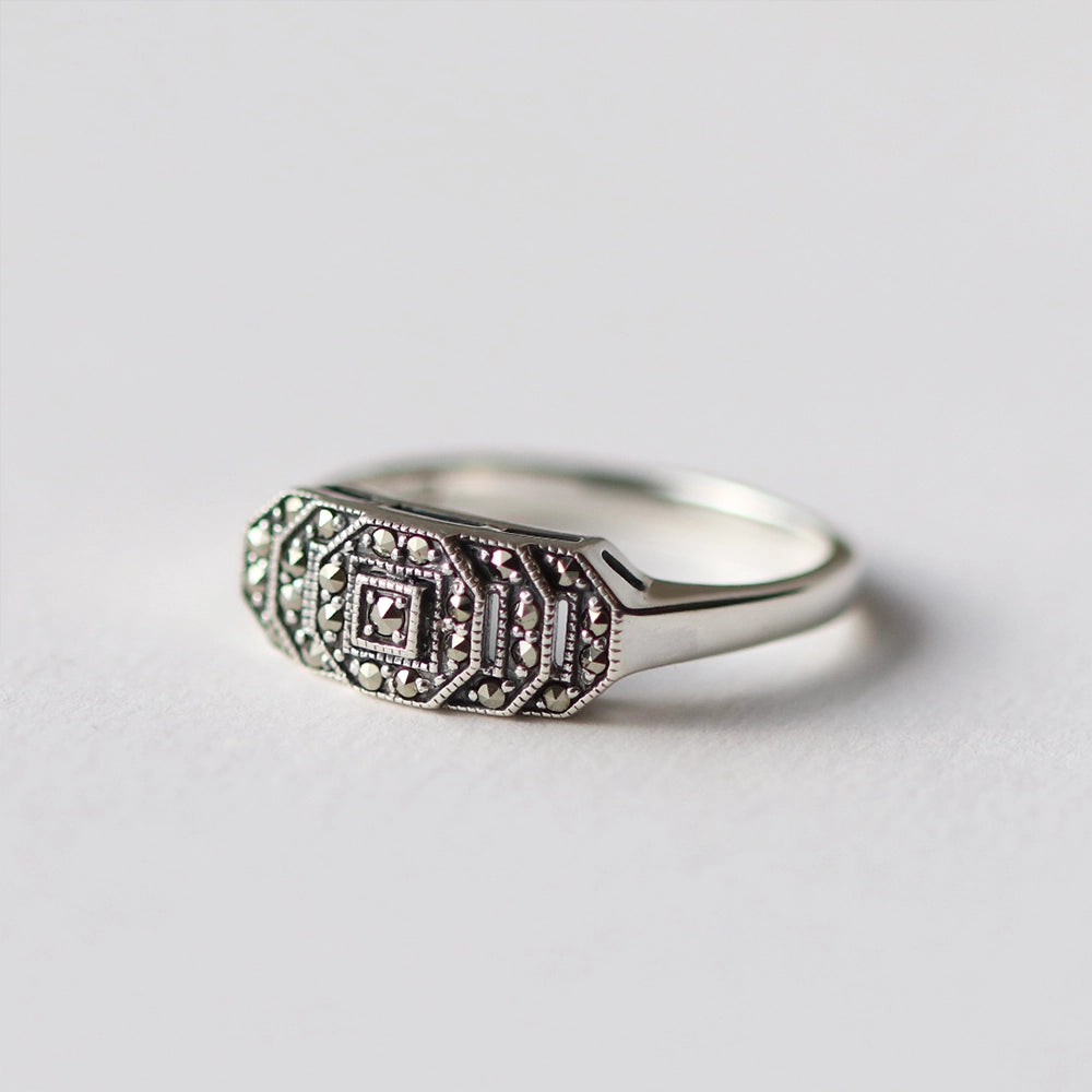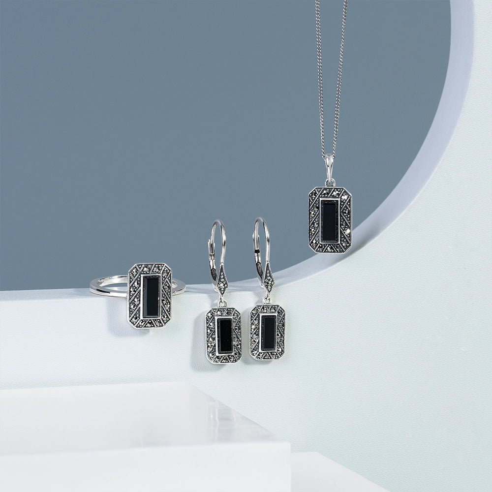 Inspirada en lo estéticamente bello y culturalmente significativo, nuestra colección de joyería de plata Art Déco combina plata esterlina con piedras preciosas de talla angular como ónix, espinela, marcasita, nácar y lapislázuli. Con atrevidos triángulos, cuadrados, círculos y arcos geométricos, cada diseño apunta a un tipo de simplicidad decadente.