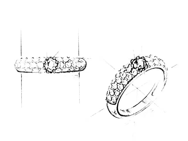 Esencialmente un tipo de engaste de cuentas. Con un nombre derivado del francés para "adoquín", un engaste de pavé describe piedras preciosas engastadas directamente en el metal con poco espacio entre cada una. Se hacen hendiduras en forma de piedras preciosas, las piedras se presionan contra el metal y luego se empuja un poco de metal sobrante sobre la piedra para fijarla. Permite que muchas piedras más pequeñas hagan alarde de su propio brillo al unísono, lo que las hace realmente impresionantes cuando están en movimiento. Debido a la naturaleza de este tipo de configuración, cambiar el tamaño del anillo puede resultar complicado, si es posible.