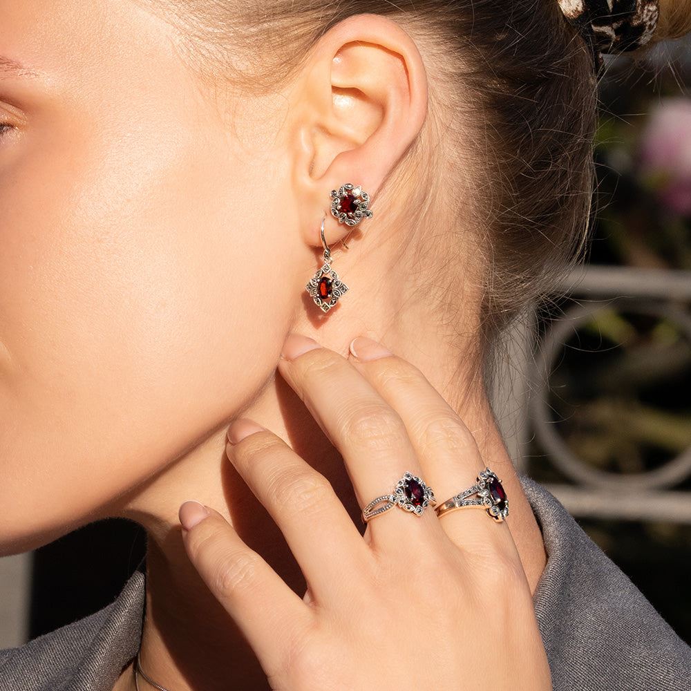 Anillo ovalado de granate y marcasita estilo art déco en plata de ley